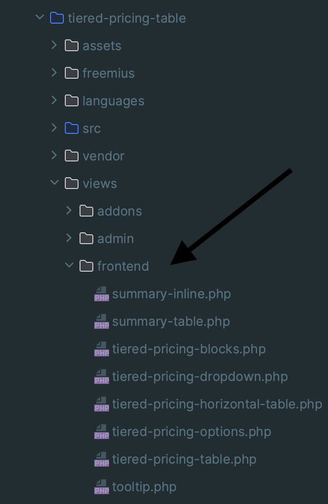 Templates that can be overridden in this way are stored in the tiered-pricing-table/views/frontend directory (as we don’t expect you to override templates that are used in the admin area)