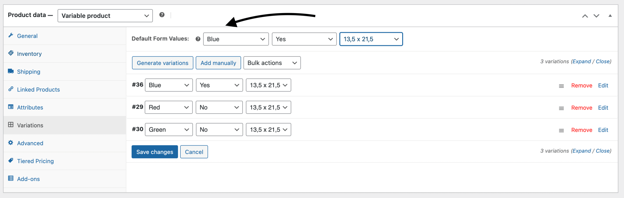 Choose default form values if you want a specific variation to be selected automatically when a user visits the product page. This also enables the Add to Cart button to appear automatically on variable product pages.